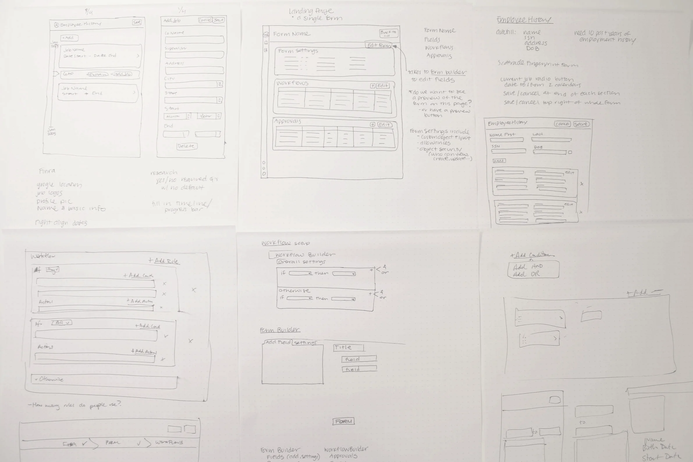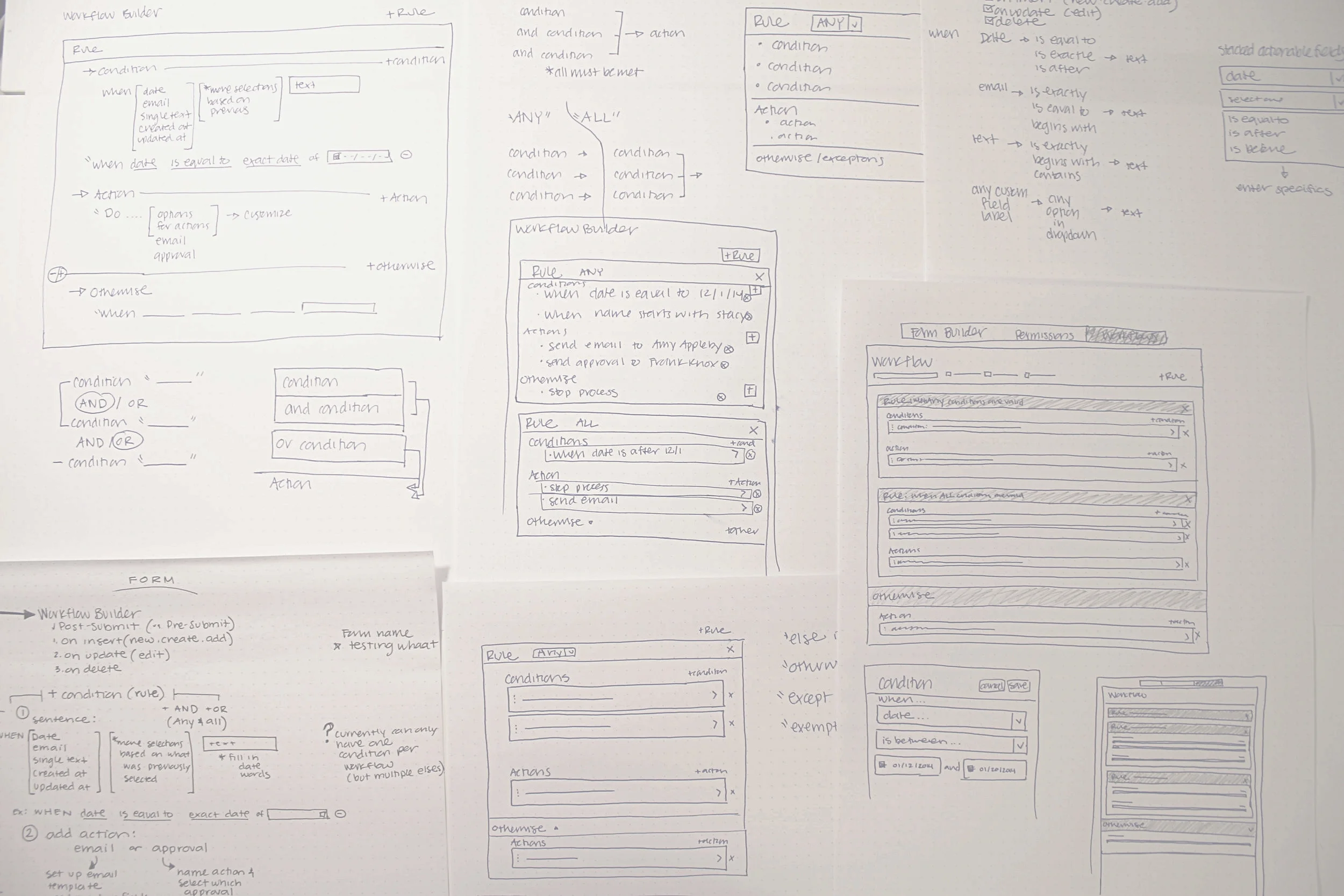 I had to work closely alongside the product team to meet form builder's specific feature requirements. I white-boarded and sketched out the numerous possible user flows to cement all the specifics. Not only did I collaborate with developers to push what was technically possible on our framework, but also worked with the customer support team to get their input on how our customers use the system.