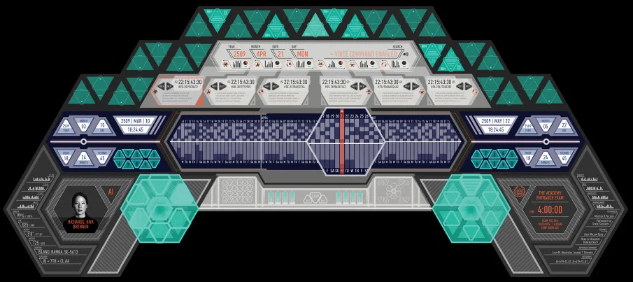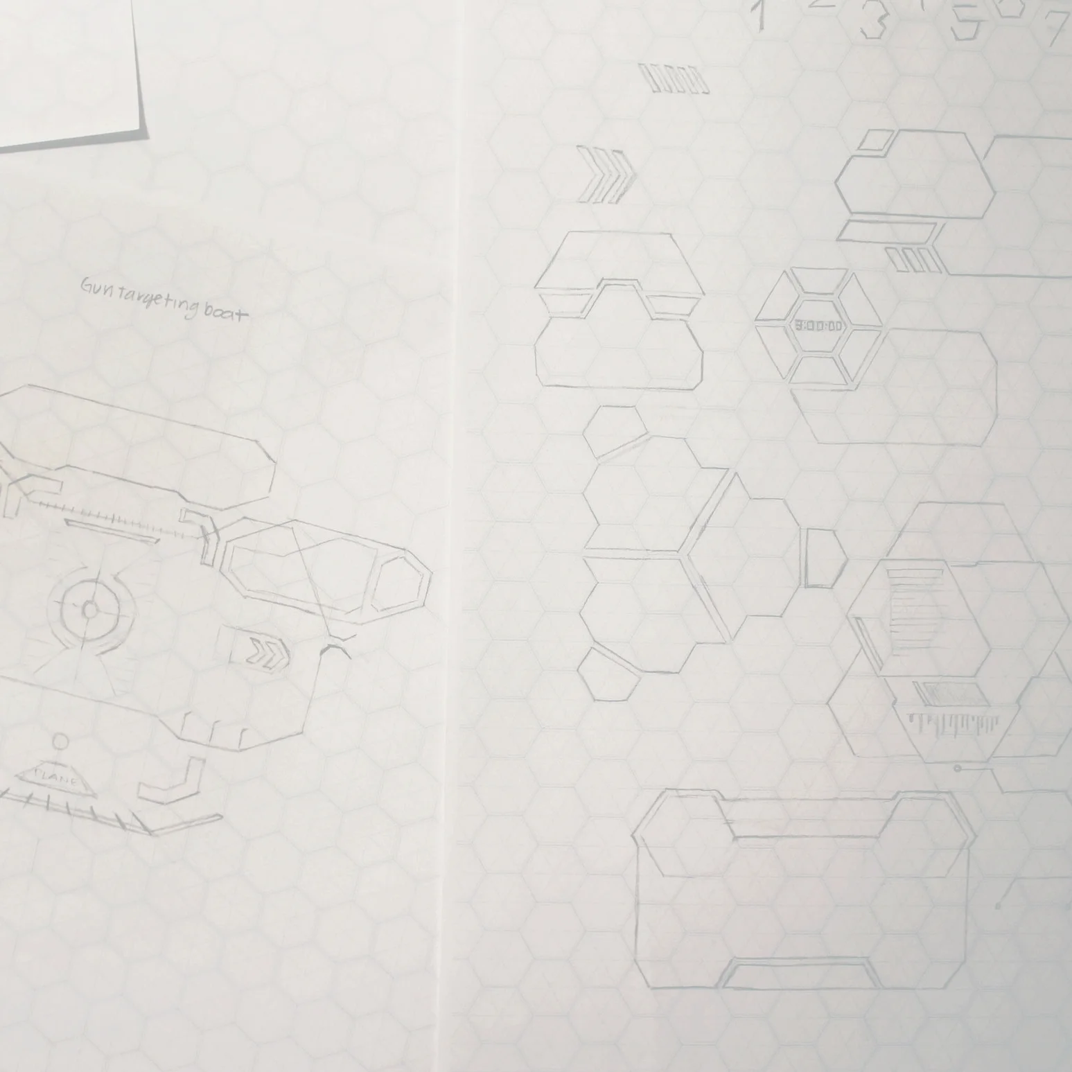 The decision to use a hexagonal grid was made because every screen utilized by the user is within arms reach and far corners cause the user to lean and reach for elements which might be too far for their arm span. Sketching was essential in this process in order to explore various shapes that could be created from this less-familiar grid. The interfaces described throughout the novel gave the opportunity to design very intricate systems, which also presented moments when the UX took a back seat to the visual appeal of the designs. This was a purposeful decision since the final product was a video rather than a functional product.