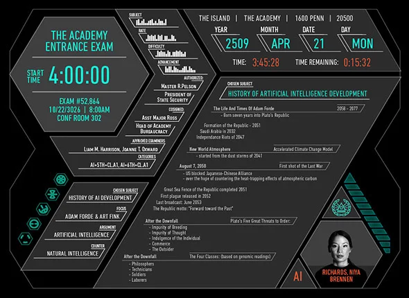 This project was done in collaboration with peer and friend Katelyn Sipek while we completed our final semester of the Bachelors of Fine Arts program at CSULB. We conceptualized and designed a system of devices and user interfaces that could accompany this story. The core of the story involves the candidates surface which focuses on a timeline to look back at history. The examiners also each have a surface to interact with while documenting the examination. There are some other smaller interfaces created which appear within the story such as a gun-targeting system and and interface to navigate the settings of an AI android.